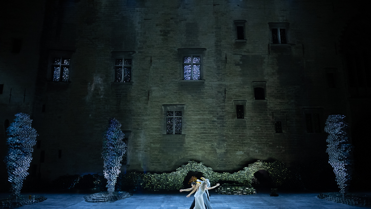 The world premiere of the ballet Midnight Souls by Carolyn Carlson, built around the monumental works of artist Jean-Michel Othoniel, installed at the heart of the Cour d’Honneur at the Palais des Papes in Avignon. Hand crafted in translucent iridescent glass, these unique artworks shine an ethereal light on the grand stage where Hugo Marchand, star dancer at the Paris Opera, and Caroline Osmont deliver a breathtaking and dream-like performance. Their dancing shows the mystery and beauty of romance while Juha Marsalo and Sara Orselli float across the stage like the ghosts of a doomed love, in this prestigious Palais that has housed centuries of history.